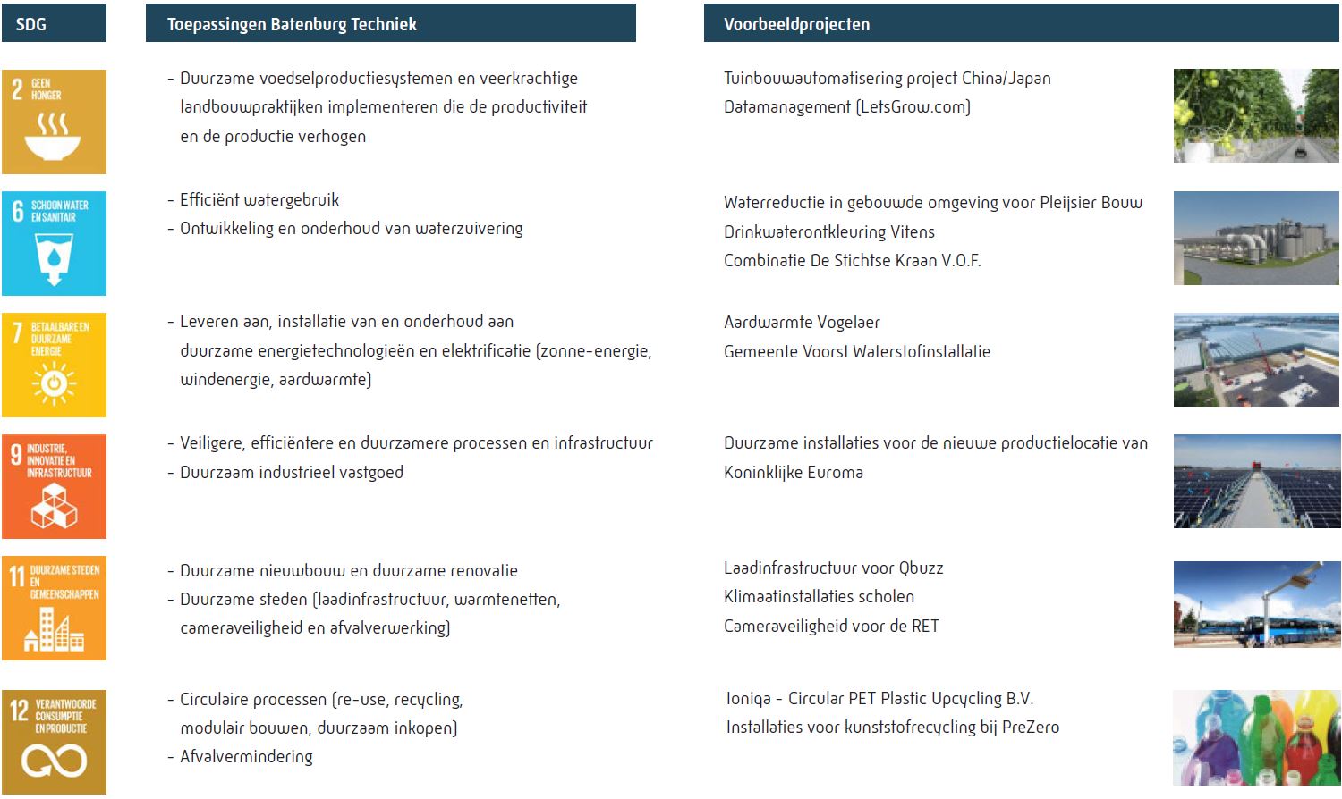 Binnen Batenburg Techniek voeren we veel projecten uit en ontwikkelen we nieuwe methoden om te werken aan het milieu en onze samenleving. We willen dit beter aangeven door dit te koppelen aan de SDG-categorieën die internationaal gebruikt worden.